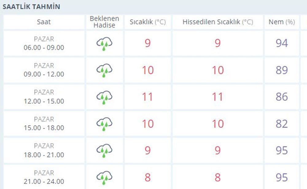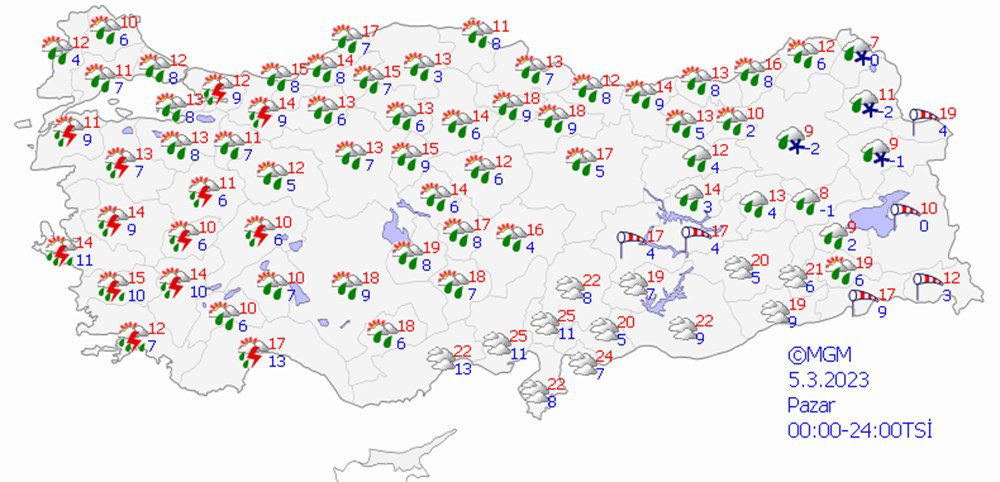 Genellikle yağmur ve sağanak, batı kesimlerde yer yer gök gürültülü sağanak, Doğu Karadeniz’in iç kesimlerinin yüksekleri ile Doğu Anadolu’nun kuzeydoğusunun yükseklerinde karla karışık yağmur ve kar şeklinde olması beklenen yağışların, Ege, Batı Akdeniz, Batı ve Orta Karadeniz.