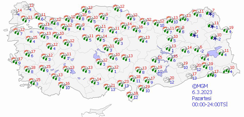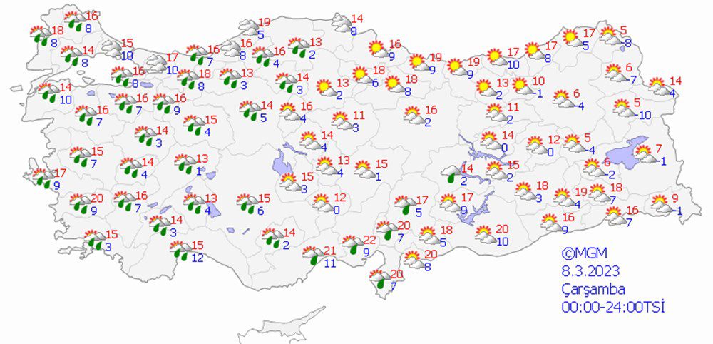 Türkiye’nin geneli parçalı ve çok bulutlu, Marmara, Ege, Batı Akdeniz, İç Anadolu (Karaman dışında), Karadeniz, Doğu Anadolu’nun kuzeyi ile Bitlis, Muş, Şırnak ve Hakkari çevrelerinin yağışlı geçeceği tahmin ediliyor.
