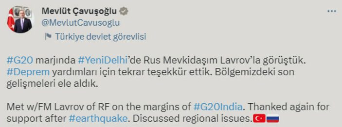 G20 marjında Yeni Delhi’de Rus mevkidaşım Lavrov’la görüştük. Deprem yardımları için tekrar teşekkür ettik. Bölgemizdeki son gelişmeleri ele aldık.