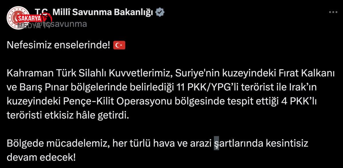 Kahraman Türk Silahlı Kuvvetlerimiz, Suriye’nin kuzeyindeki Fırat Kalkanı ve Barış Pınar bölgelerinde belirlediği 11 PKK/YPG’li terörist ile Irak’ın kuzeyindeki Pençe-Kilit Operasyonu bölgesinde tespit ettiği 4 PKK’lı teröristi etkisiz hâle getirdi.