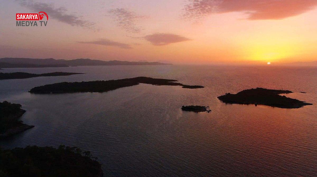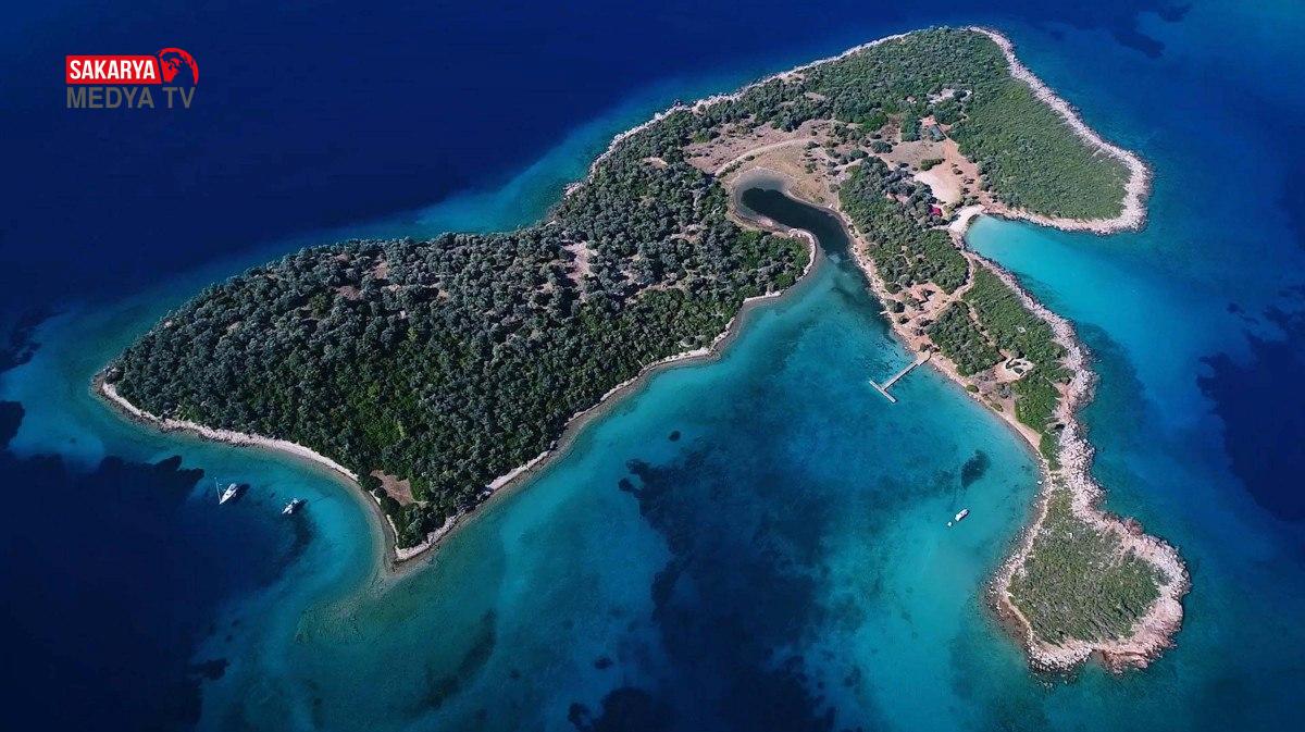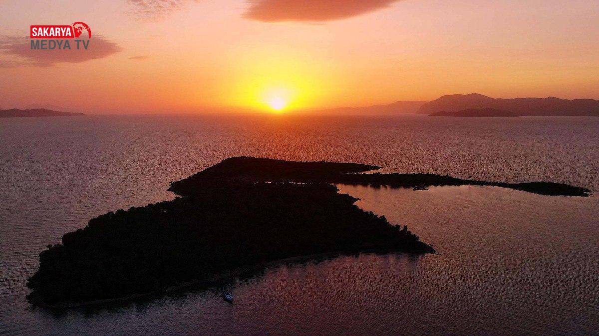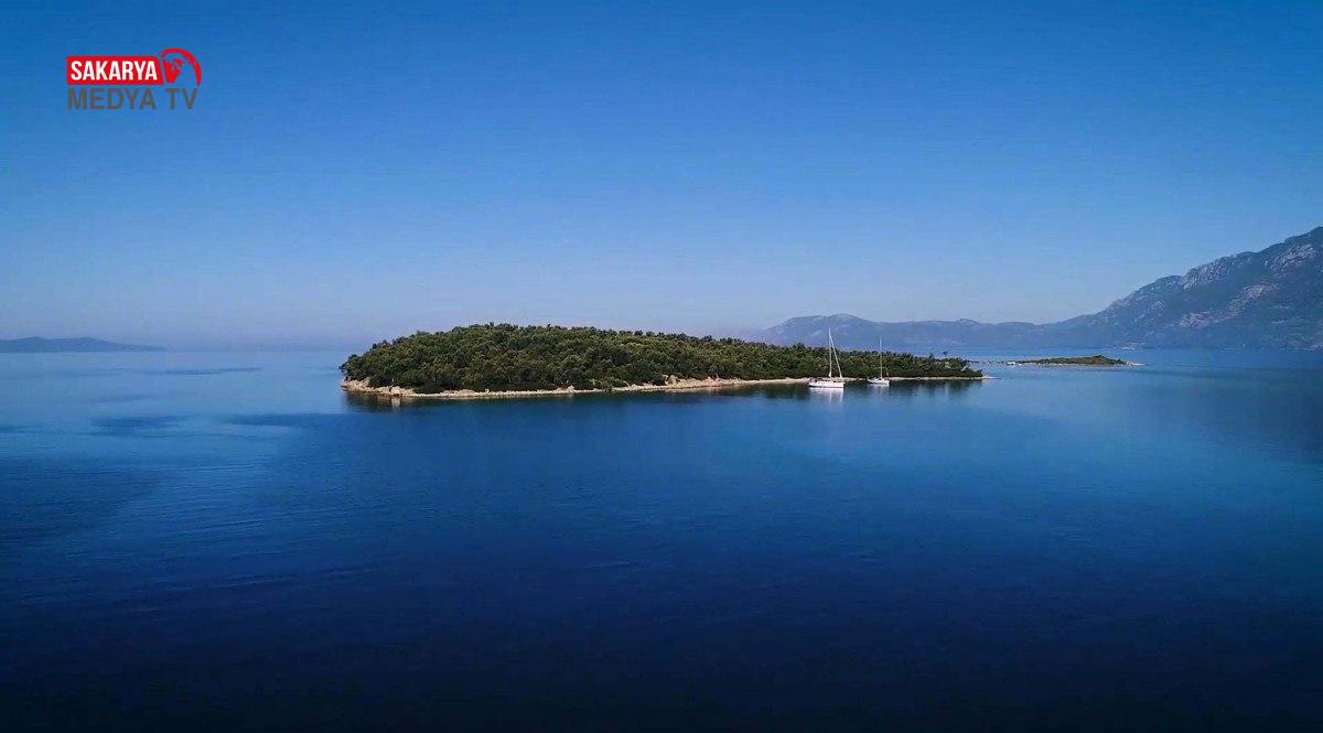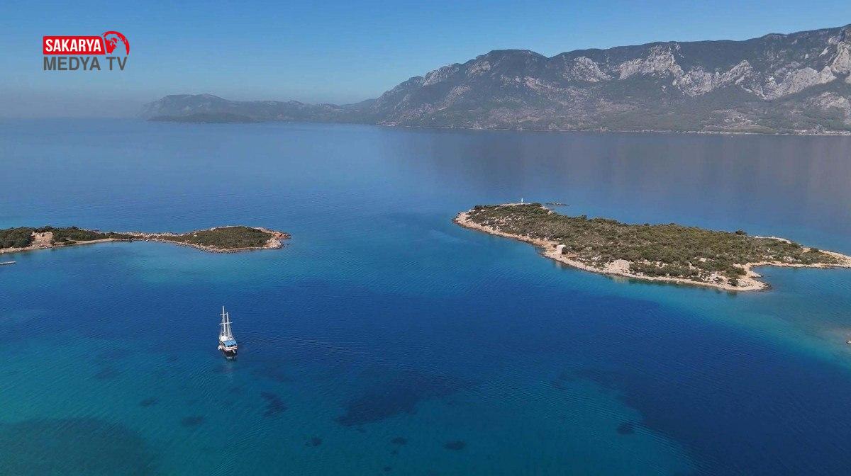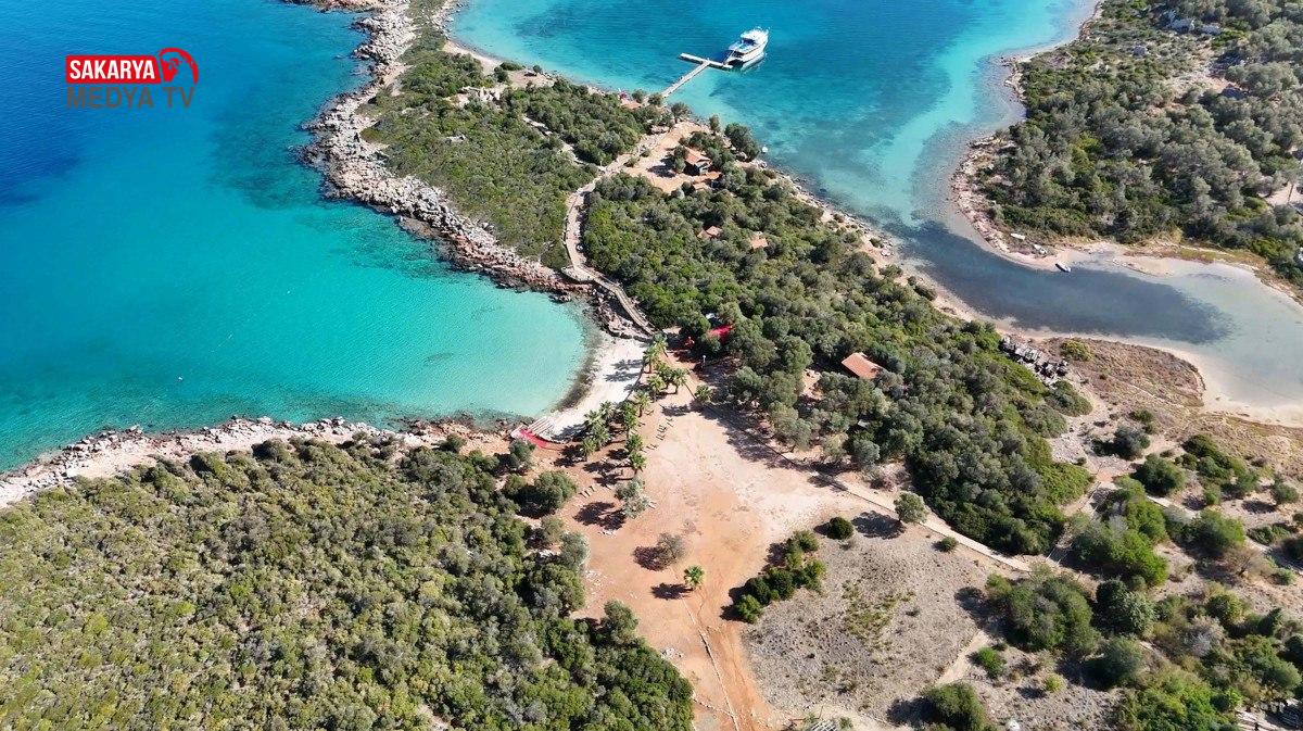 Altın sarısı renkli kumuyla ünlü Sedir Adası’nın görüntüsü, havadan dronla görüntülendi.