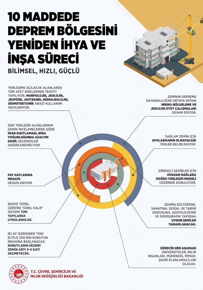 Bakan Kurum’un, “10 Maddede Deprem Bölgesini Yeniden İhya ve İnşa Süreci, Bilimsel, Hızlı ve Güçlü” ifadesiyle paylaştığı bilgiye göre, yapılacak çalışmalar şöyle sıralandı: