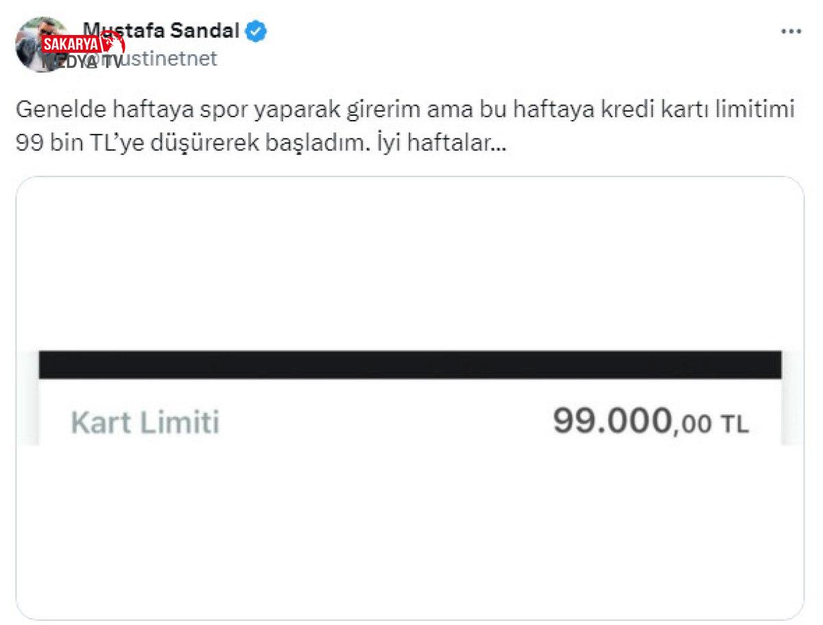 Sandal, yaptığı paylaşımda kredi kartının limitini düşürdüğünü belirterek şu tabirleri kullandı;Genelde haftaya spor yaparak girerim lakin bu haftaya kredi kartı limitimi 99 bin TL’ye düşürerek başladım.