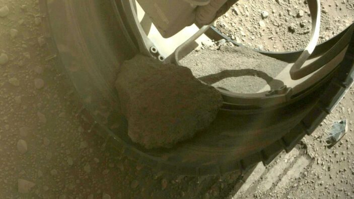 NASA’nın Mars yüzeyini araştıran Perseverance aracı, tekerleklerine takılan taşlar nedeniyle zor durumda. 2022’nin başlarında ön tekerleğine sıkışan taşla hala yolculuk yapan aracın, şimdi de sağ ön tekerleğine büyük bir taş sıkıştı.