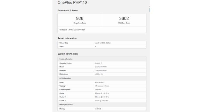 Geekbench platformunda PHP110 model numarası ile görüntülenen OnePlus Ace 2V, 3.05GHz hızında çalışan bir Cortex-X2 çekirdeği, her biri 2.85GHz hızında çalışan üç Cortex-A710 çekirdeği ve dört Cortex-A510 çekirdeği dahil olmak üzere toplam sekiz çekirdekli MediaTek Dimensity 9000 işlemciden güç alıyor. Liste ayrıca cihazın 16 GB belleğe ve entegre Mali G710 grafik birimine sahip olacağını da doğruluyor.