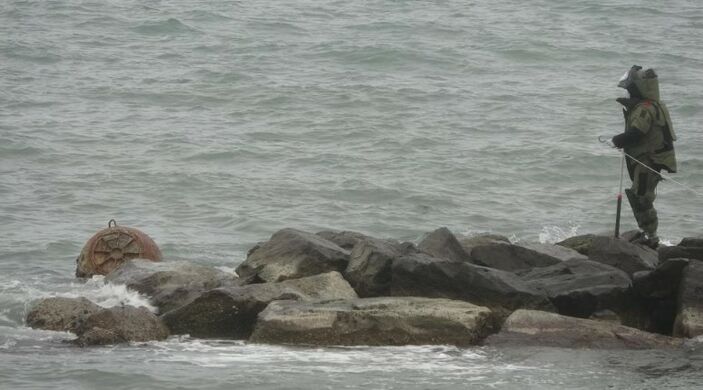 Sahilden yaklaşık 30 metre açıkta bulunan ve mayına benzediği görülen cisim, dalgaların şiddetiyle kıyıya yaklaşarak kayalıklara takıldı.