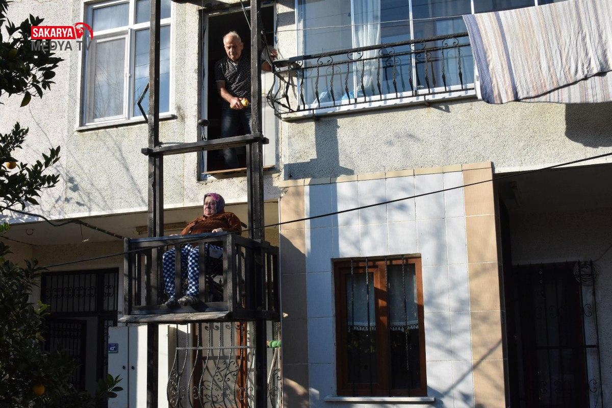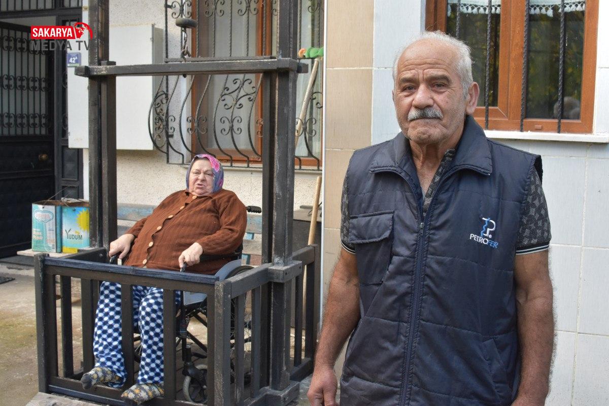 Eşi Meryem Okur’u evinin dışına yaptığı asansör dışarı çıkaran Okur, “Bu asansör sayesinde eşimi evden dışarı çıkarabiliyorum. Temiz hava alması için dışarıya çıkarıyorum, eşe dosta götürüyorum. Eğer bu asansör olmasaydı, eşimi evden dışarı çıkarma imkanım yoktu.