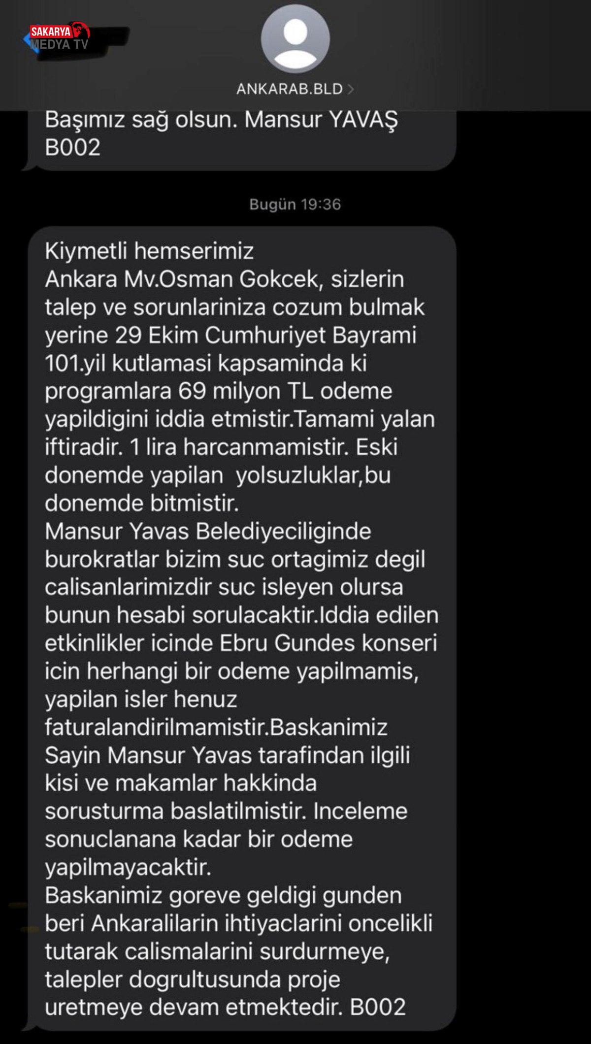 Osman Gökçek, tekrar paylaşımında, söylediği tezleri yalanlayan Mansur Yavaş hakkında “Sayın Mansur Yavaş benim hakkımda millete palavra bildiri atacağınıza Kültür daire Başkanlığınızın mali hizmetlerinize ödemeyi yapın diye gönderdiği belgeyi açıklayın. İşte Mansur Yavaş‘ın attığı bildiri ve 69 milyon ödenmesi için gönderdiği o belge” notuyla paylaşım yaptı ve Ankara Kültür daire Başkanlığı’nın, mali hizmetlere Ebru Gündeş konseri için ‘ödemeyi yapın’ diye gönderdiği evrakı yayınladı.