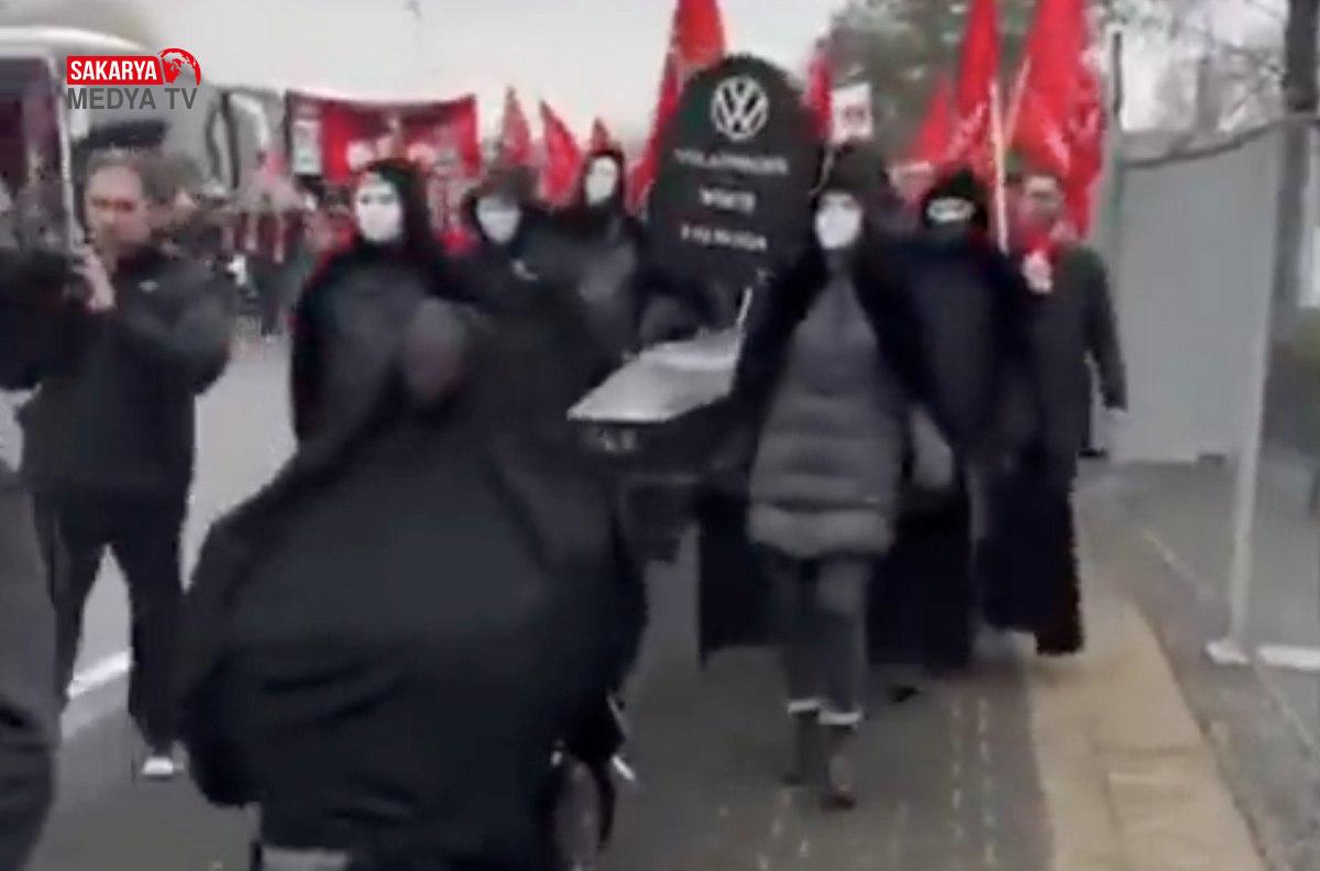 Ayrıca emekçiler ellerinde tabut ve giydikleri siyah elbiselerle birlikte Volkswagen için cenaze merasimi düzenlediler.