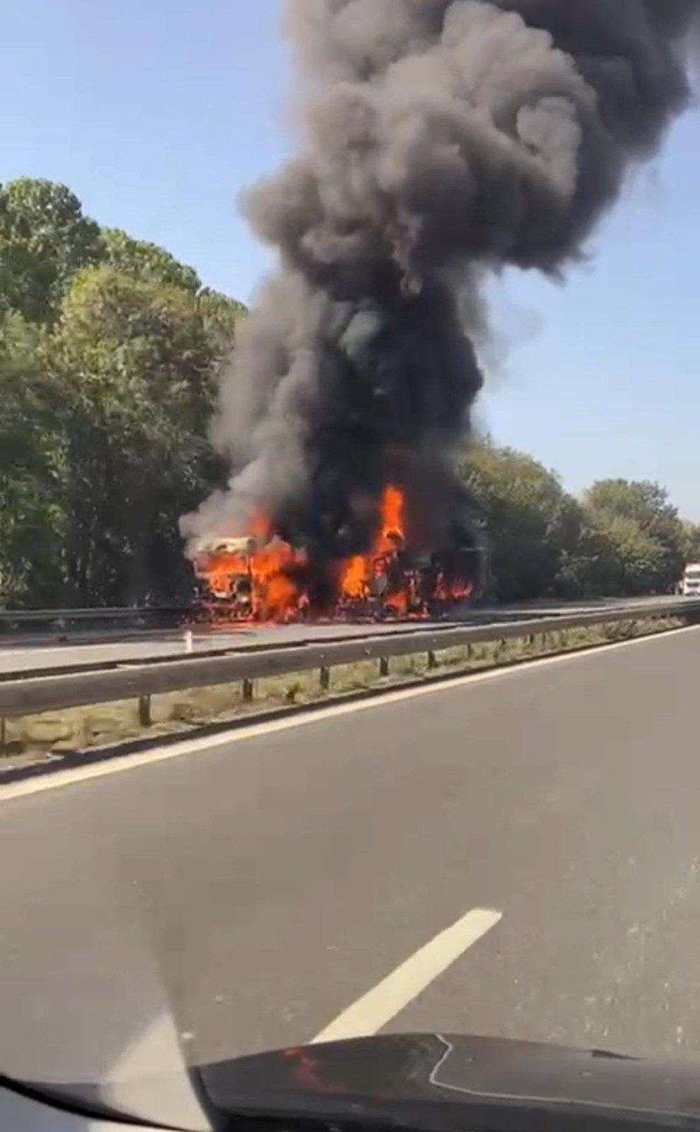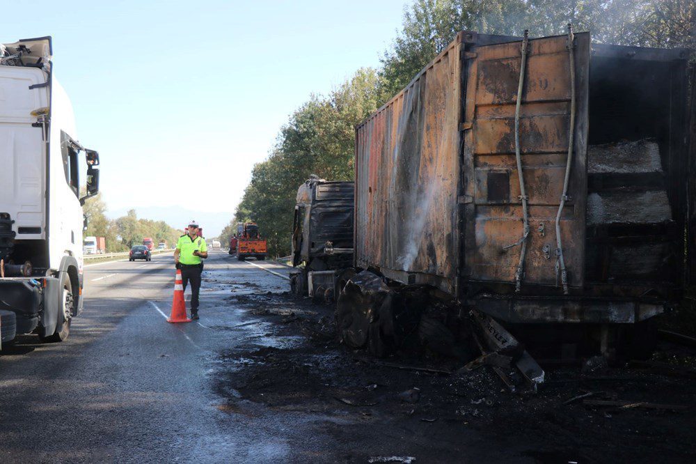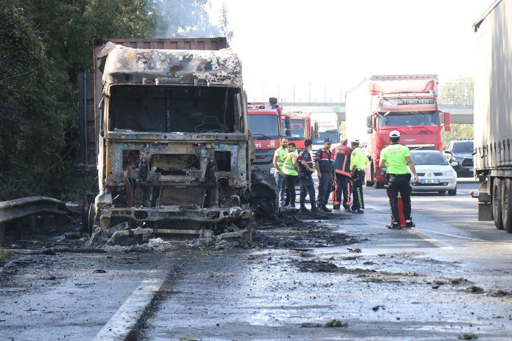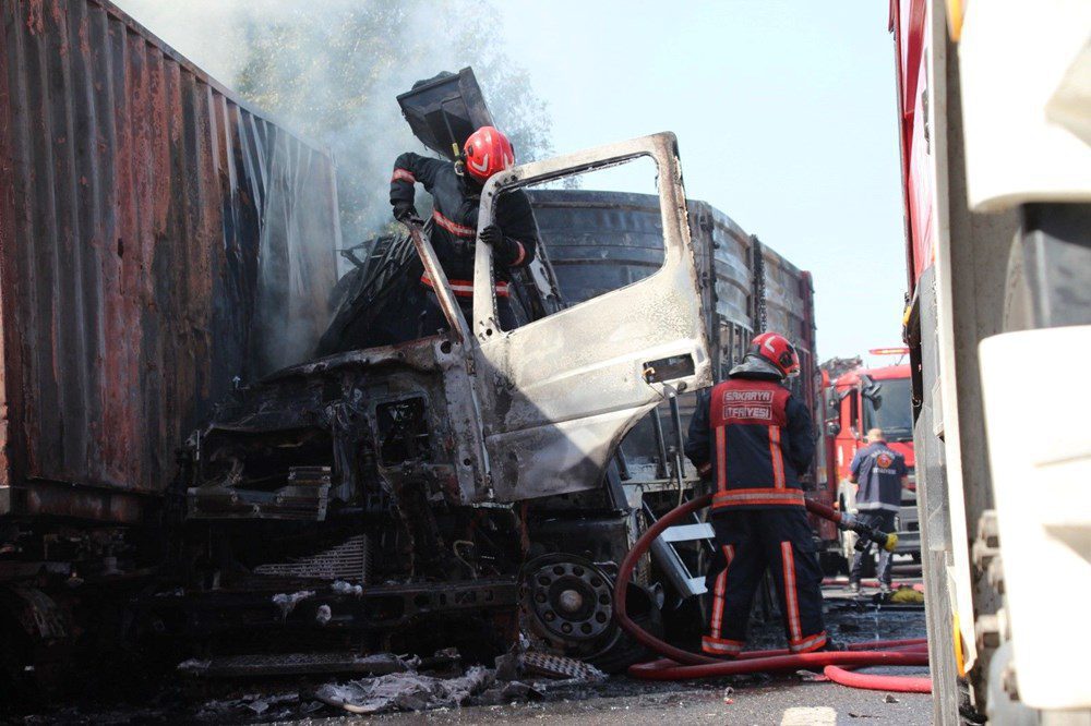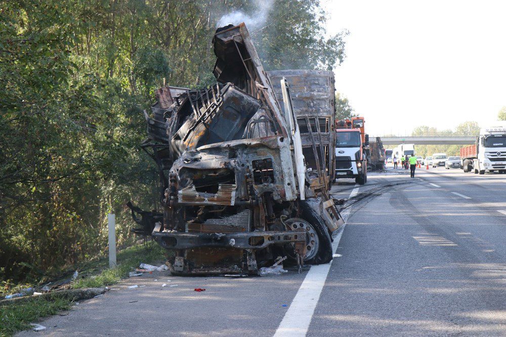 Kaza, Anadolu Otoyolu Erenler gişeleri mevkiinde meydana geldi. Edinilen bilgiye nazaran, Ankara istikametinde ilerlemekte olan Mehmet Akif Ç. (22) denetimindeki 41 AOF 558 plakalı TIR’a, tıpkı istikamete ilerlemekte olan Remzi Y. (60) yönetimindeki 57 DS 350 plakalı TIR çarptı. Çarpışmanın tesiri ile her iki TIR da alev aldı. Kısa müddette alev topuna dönen TIR’lar büsbütün yanarak kullanılamaz hale geldi.