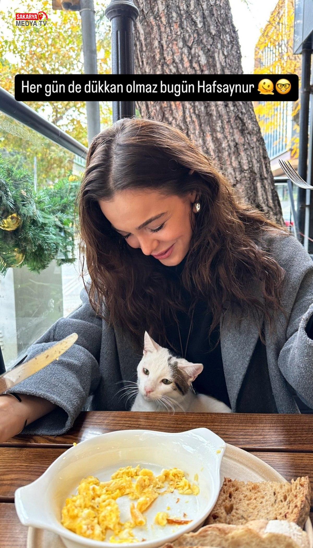 Kahvaltı sırasında yanlarına gelen kedi, Sancaktutan’ın kucağına oturdu. Aka, gülümseten anları ‘Her gün de dükkan olmaz bugün Hafsaynur’ notuyla paylaştı.