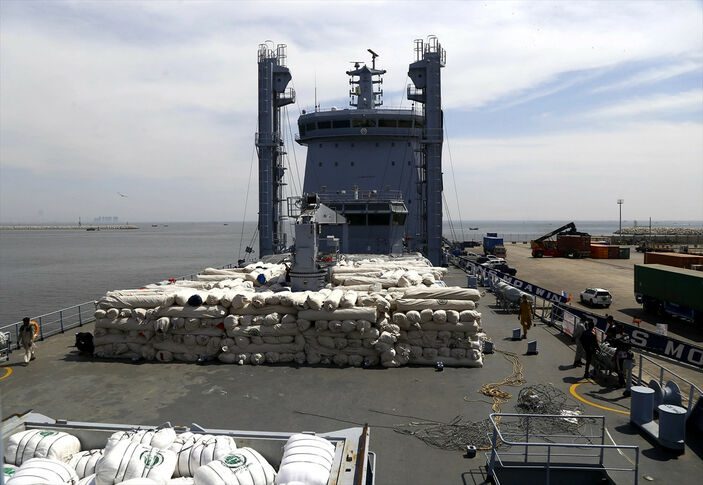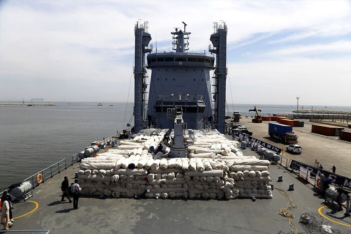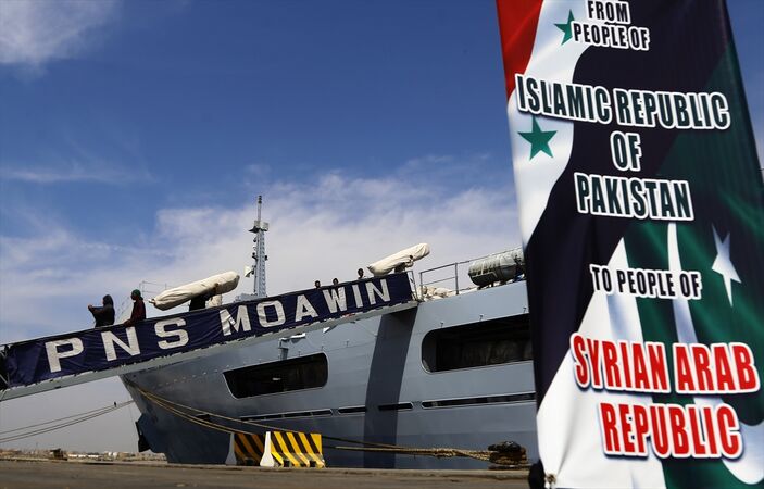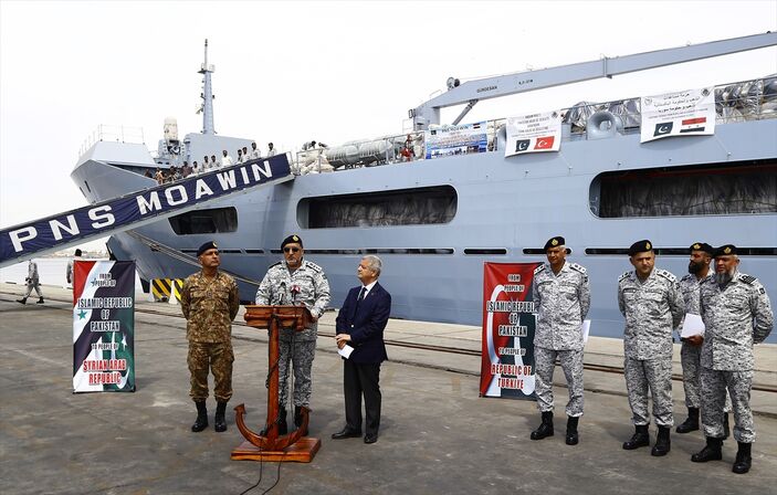 Türkiye’deki depremzedeler için 2 bin 600 kışlık çadır taşıyan Pakistan Deniz Kuvvetlerine ait gemi, Suriye’ye de 22 bin battaniye, gıda kolileri ve jeneratörler ulaştıracak.