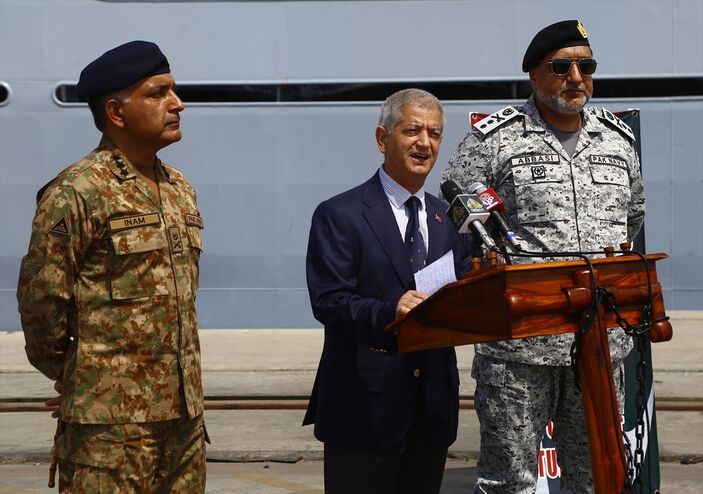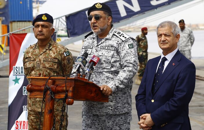 Pakistan’da Karaçi Limanı’nda düzenlenen törene Türkiye’nin Karaçi Başkonsolosu Cemal Sangu, Ulusal Afet Yönetim Ajansı (NDMA) Başkanı Korgeneral İnam Haydar Malik ve Pakistan Deniz Kuvvetleri Filo Komutanı Tuğamiral Faysal Abbasi katıldı. Sangu, yaptığı açıklamada, Pakistan’ın Türkiye’deki depremzedelere yönelik yardımları için teşekkür ederek, iki ülkenin zor zamanlarda daima yan yana durduğunu söyledi.