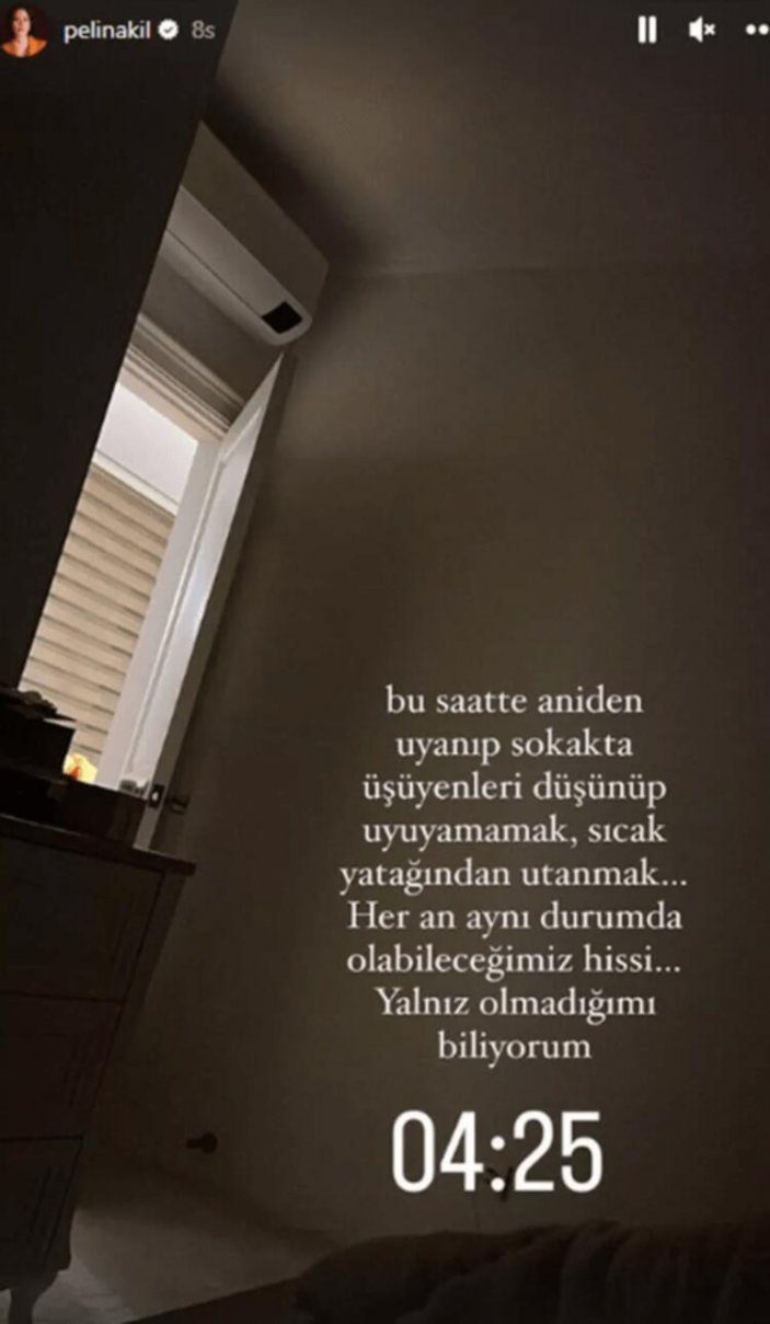 Ünlü oyuncu Pelin Akil, Hatay’da altı kişinin hayatını kaybettiği 6.4 ve 5.8 büyüklüğündeki depremler sonrası dikkat çeken bir paylaşımda bulundu.