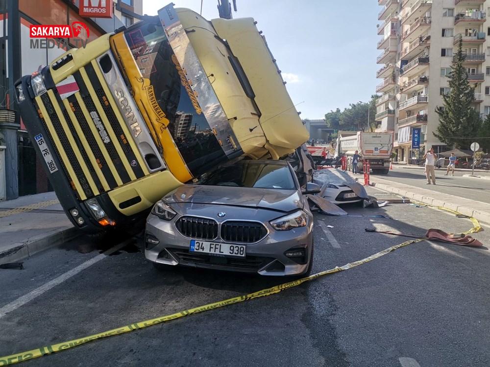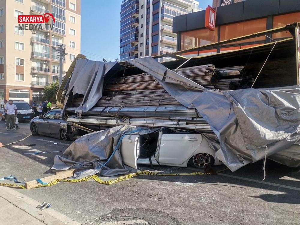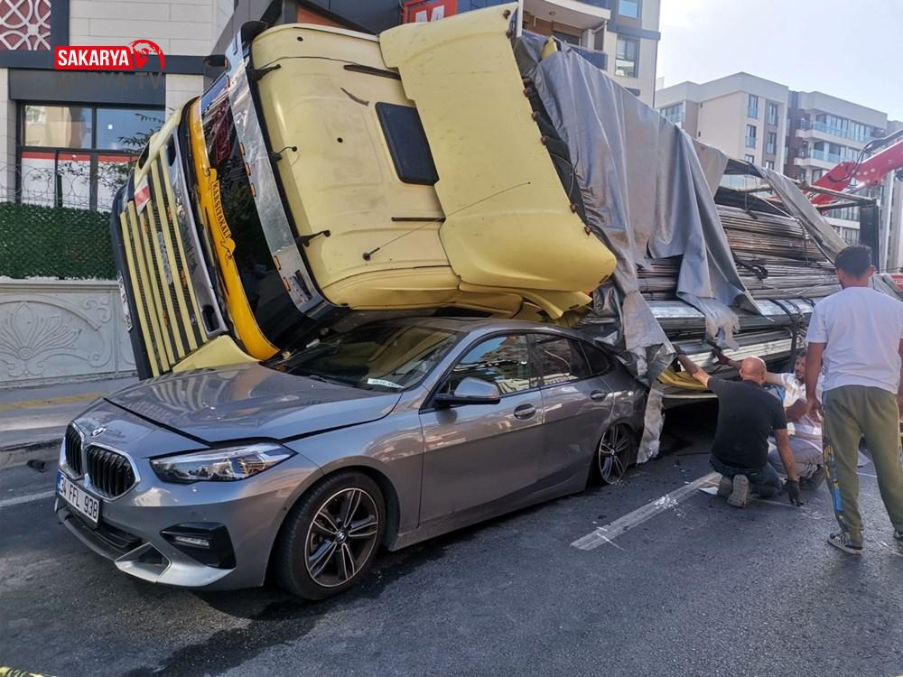 Görüntülerde demir yüklü TIR’ın kaldırıma çıkarak araçların üzerine devrilme anı yer alıyor.