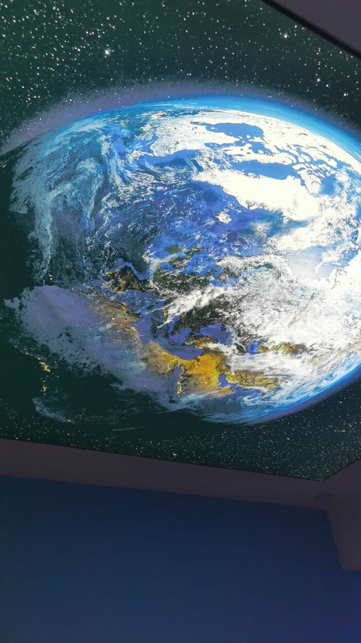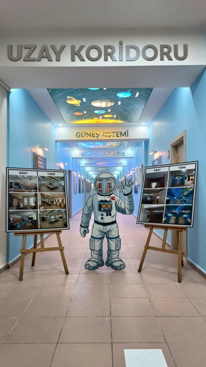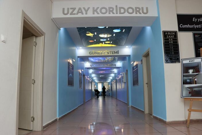 Koridor boyunca tavanda ve duvarlarda yer alan; Güneş sistemi, dünya, gezegenler, uzay araçları ve galaksiler gibi uzaya dair bilgi ve görsellerle öğrencilerin bilime olan ilgisinin artırılması amaçlanıyor.