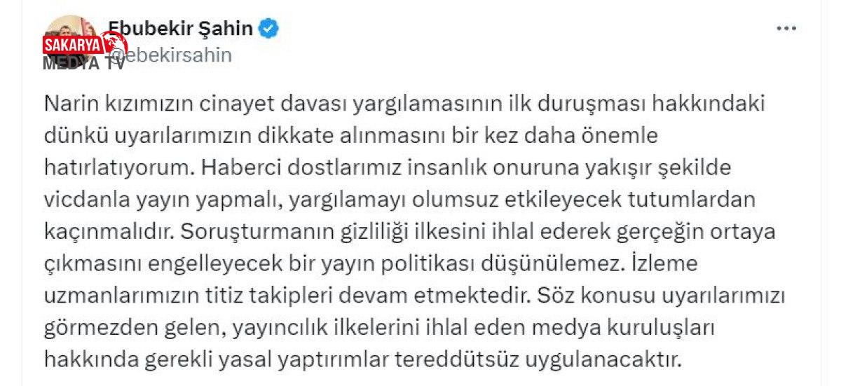 Diğer yandan, RTÜK Başkanı Şahin, Diyarbakır’daki Narin Güran cinayeti davasına ilişkin de medya mensuplarına uyarıda bulunarak şu ifadeleri kullandı:
