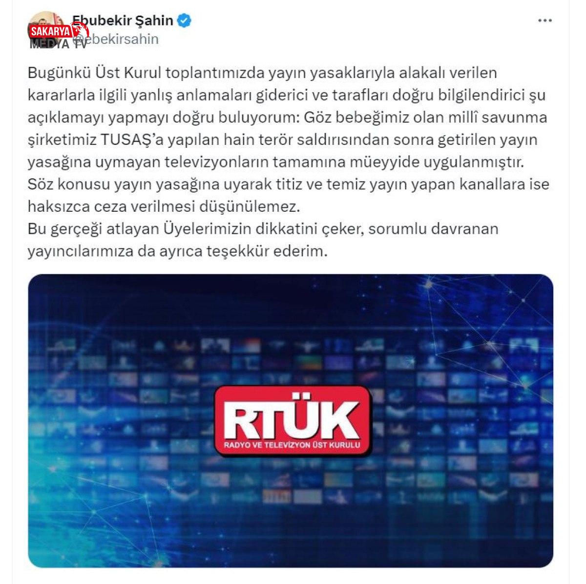 Türk Havacılık ve Uzay Sanayii’ne (TUSAŞ) yönelik terör saldırısının ardından getirilen yayın yasağına uymayan televizyonlara değinen Şahin, devamında şu ifadelere yer verdi: