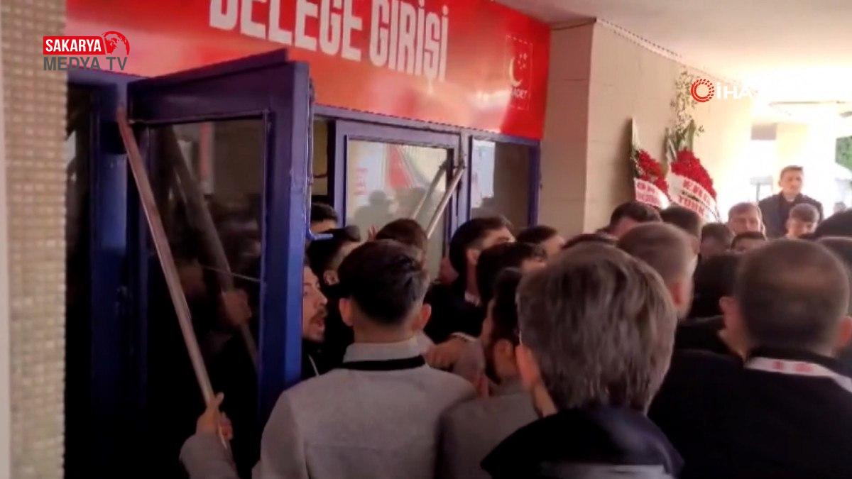 Bazı delegeler ile parti vazifelileri ortasında yumruklu hengame anları kameralara yansıdı.