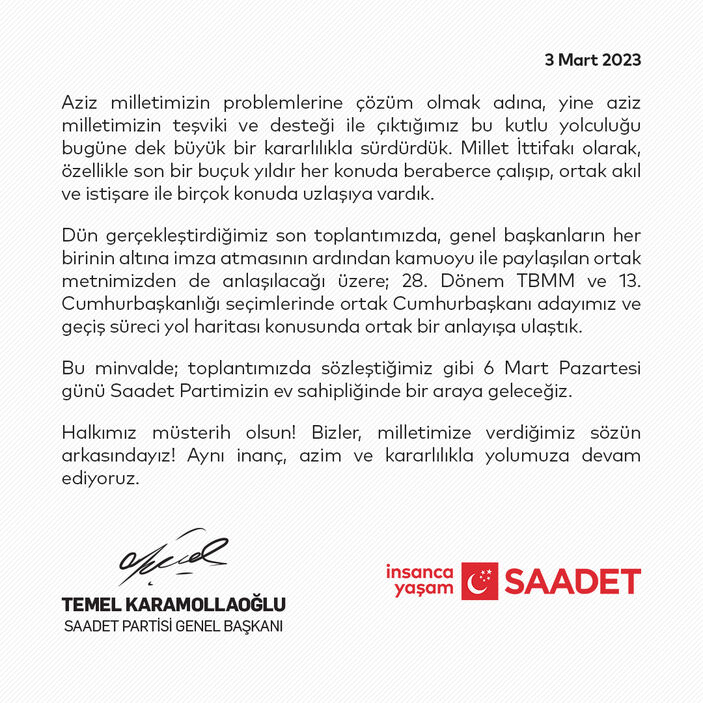Aziz milletimizin problemlerine çözüm olmak adına, yine aziz milletimizin teşviki ve desteği ile çıktığımız bu kutlu yolculuğu bugüne dek büyük bir kararlılıkla sürdürdük. Millet ittifakı olarak, özellikle son bir buçuk yıldır her konuda beraberce çalışıp, ortak akıl ve istişare ile birçok konuda uzlaşıya vardık. Dün gerçekleştirdiğimiz son toplantımızda, genel başkanların her birinin altına imza atmasının ardından kamuoyu ile paylaşılan ortak metnimizden de anlaşılacağı üzere; 28. Dönem TBMM ve 13. Cumhurbaşkanlığı seçimlerinde ortak Cumhurbaşkanı adayımız ve geçiş süreci yol haritası konusunda ortak bir anlayışa ulaştık. Bu minvalde; toplantımızda sözleştiğimiz gibi 6 Mart Pazartesi günü Saadet Partimizin ev sahipliğinde bir araya geleceğiz. Halkımız müsterih olsun! Bizler, milletimize verdiğimiz sözün arkasındayız! Aynı inanç, azim ve kararlılıkla yolumuza devam ediyoruz.