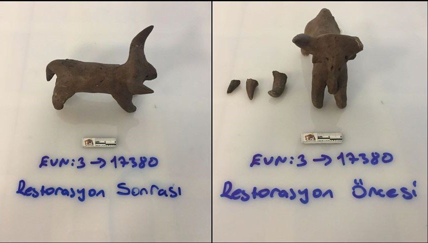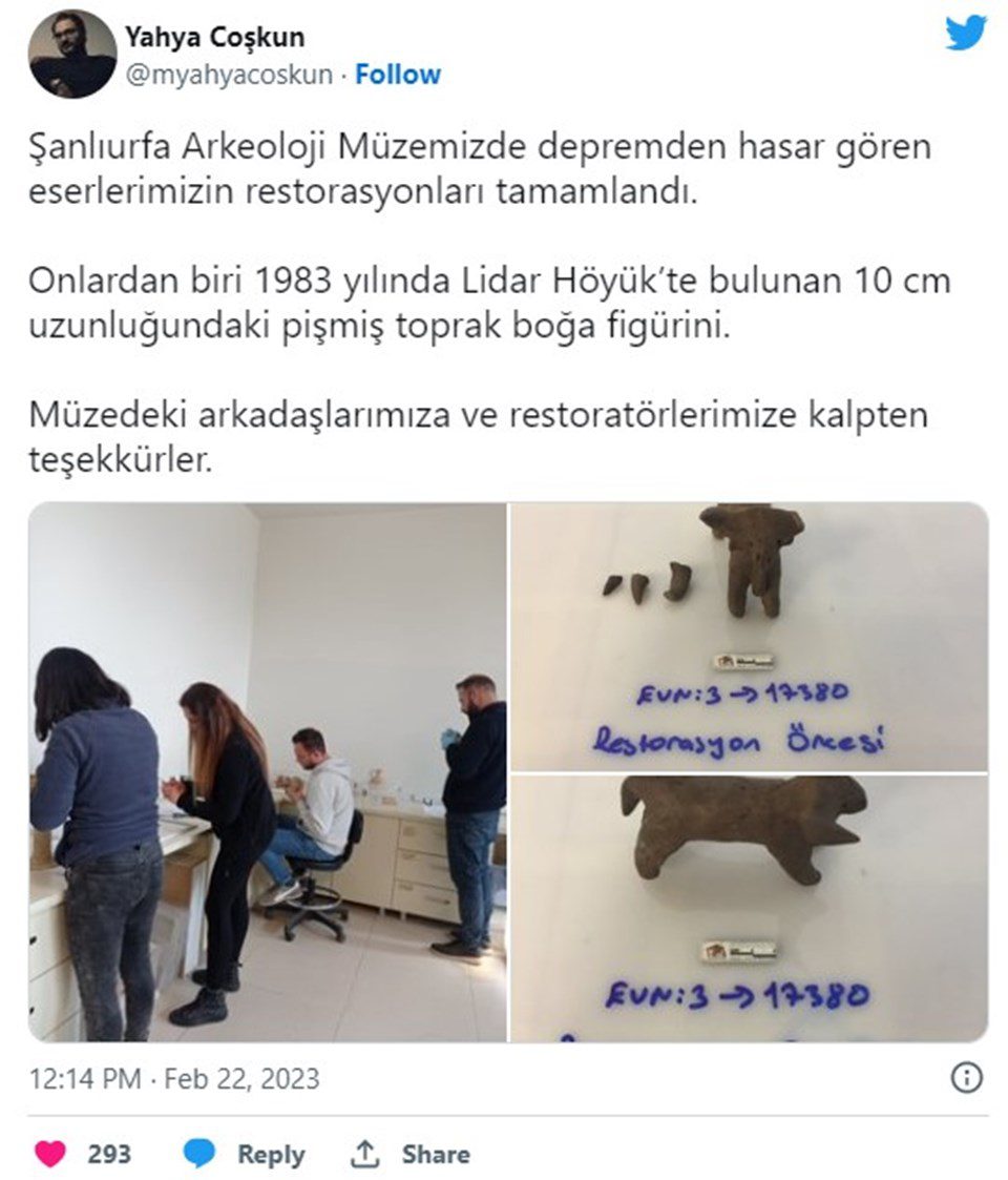Kahramanmaraş merkezli depremlerde zarar gören Şanlıurfa Arkeoloji Müzesindeki eserlerin restorasyonunun tamamlandığını belirten Coşkun, “Onlardan biri 1983 yılında Lidar Höyük’te bulunan 10 santimetre uzunluğundaki pişmiş toprak boğa figürini. Müzedeki arkadaşlarımıza ve restoratörlerimize kalpten teşekkürler” dedi.