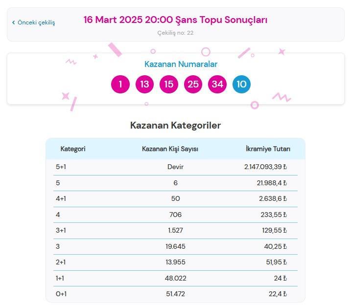Şans Topu çekilişi 16 Mart Pazar akşamı çekiliş sonuçları açıklandı. Bu akşam saat 20.00’de yapılan çekiliş sonrası 5+1 bilen çıkmayınca 2 milyon 147 bin lira pahasındaki büyük ikramiye devretti. Sisal Talih tarafından noter huzurunda gerçekleşen çekiliş Ulusal Piyango’nun YouTube kanalı üzerinden de canlı olarak yayınlanıyor. Çekilişin çabucak akabinde sonuçlar Ulusal Piyango online ve hurriyet.com.tr üzerinden de takip ediliyor. İşte 16 Mart Baht Topu çekiliş sonuçları…