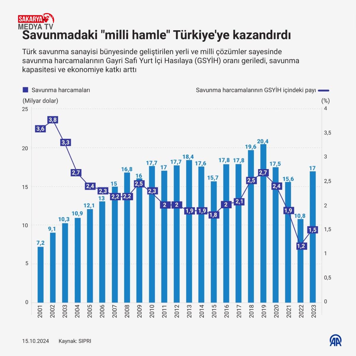 Son yıllarda Türkiye’nin savunma sanayiide yerli ve milli üretim oranının hızla artması, ülkenin askeri harcamalarının GSYİH’ye oranında önemli bir düşüşe neden oldu. Stockholm Uluslararası Barış Araştırmaları Enstitüsü’nün (SIPRI) verilerine göre, Türkiye 2000’li yılların başlarında savunma harcamalarını artırarak bölgesel ve küresel etkisini güçlendirmeye odaklandı, ancak yerli ve milli savunma sanayiinin gelişmesiyle birlikte, askeri harcamaların ekonomik büyümeye oranı yıllar içinde geriledi. 2001 yılında Türkiye’nin savunma harcamaları 7,2 milyar dolar olarak gerçekleşirken, bu rakam aynı yıl Türkiye’nin GSYİH’sının yüzde 3,6’sına karşılık geldi.