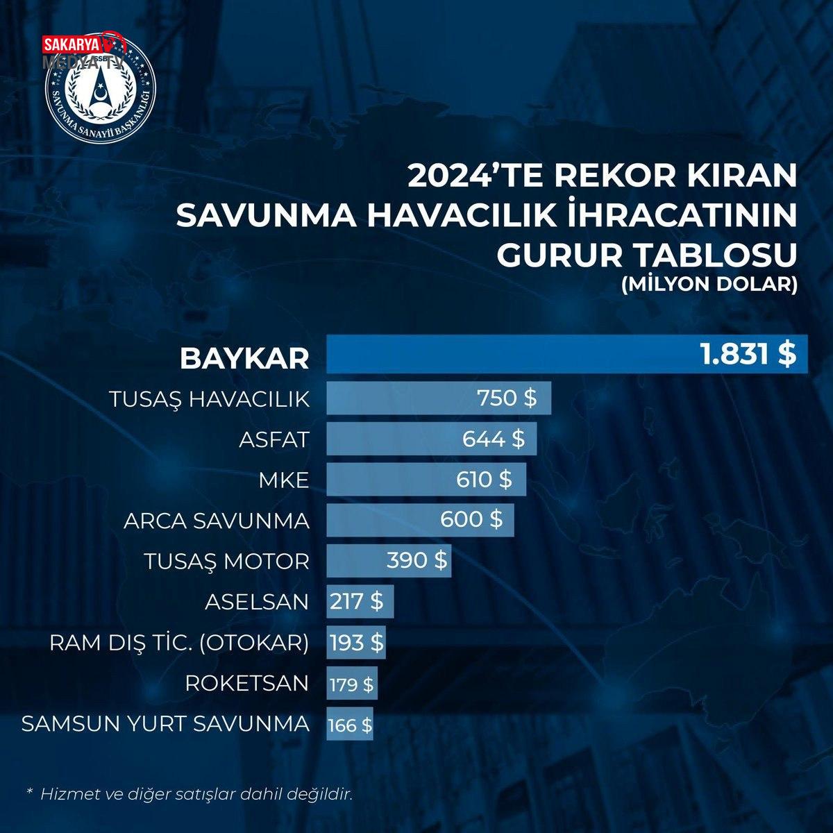 AA Türkiye savunma alanında geliştirdiği yerli tahlillerle dünyanın gözdesi pozisyonuna geldi. Sadece geliştirdiği sistemlerle Türkiye’nin gereksinimlerini karşılamakta yetinmeyen kesim yaptığı ihracatı ile de göz dolduruyor. Bu evrede Cumhurbaşkanlığı Savunma Sanayii Başkanlığı (SSB), geçen yıl en fazla ihracat yapan savunma ve havacılık firmalarını açıkladı. İhracat sayılarına hizmet ve başka satışlar dahil edilmedi. Türkiye’de geçen yıl savunma ve havacılık alanında en fazla ihracat yapan firmalar sırasıyla Baykar, TUSAŞ Havacılık, ASFAT, Makine ve Kimya Sanayisi (MKE), ARCA Savunma, TUSAŞ Motor, ASELSAN, RAM Dış Ticaret, ROKETSAN ve Samsun Yurt Savunma oldu.