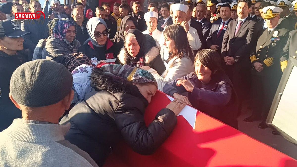 Şehidin aile üyeleri ve yakınları, Türk bayrağına sarılı tabutuna sarılıp gözyaşı döktü.