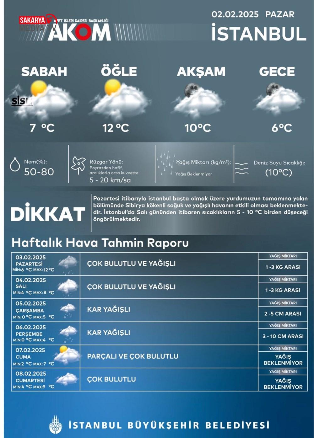 İstanbul Büyükşehir Belediyesi (İBB) Afet Uyum Merkezi ise İstanbul’da yaşayanları iki gün boyunca tesirli olacak kar yağışına karşı uyardı. AKOM açıklamasında, yurt genelindeki hava sıcaklıklarının haftanın birinci gününden itibaren düşmeye başlayacağı kaydedildi.