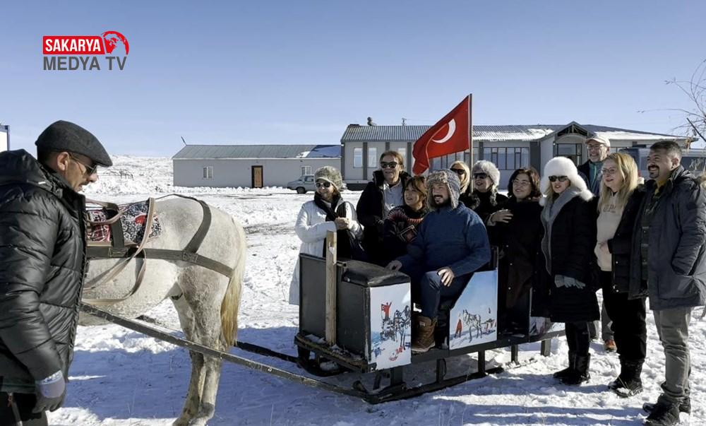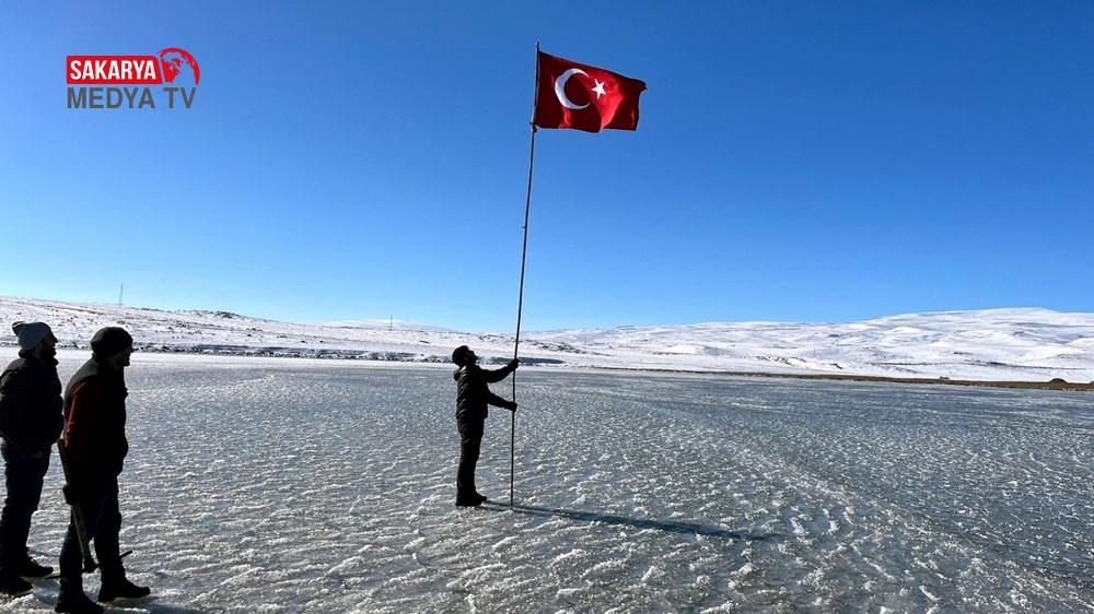 Kızakçılar, gölün donan kısmına üzerinde büyük bir Türk bayrağının bulunduğu demiri dikerek hatıra fotoğrafı çektirdi.