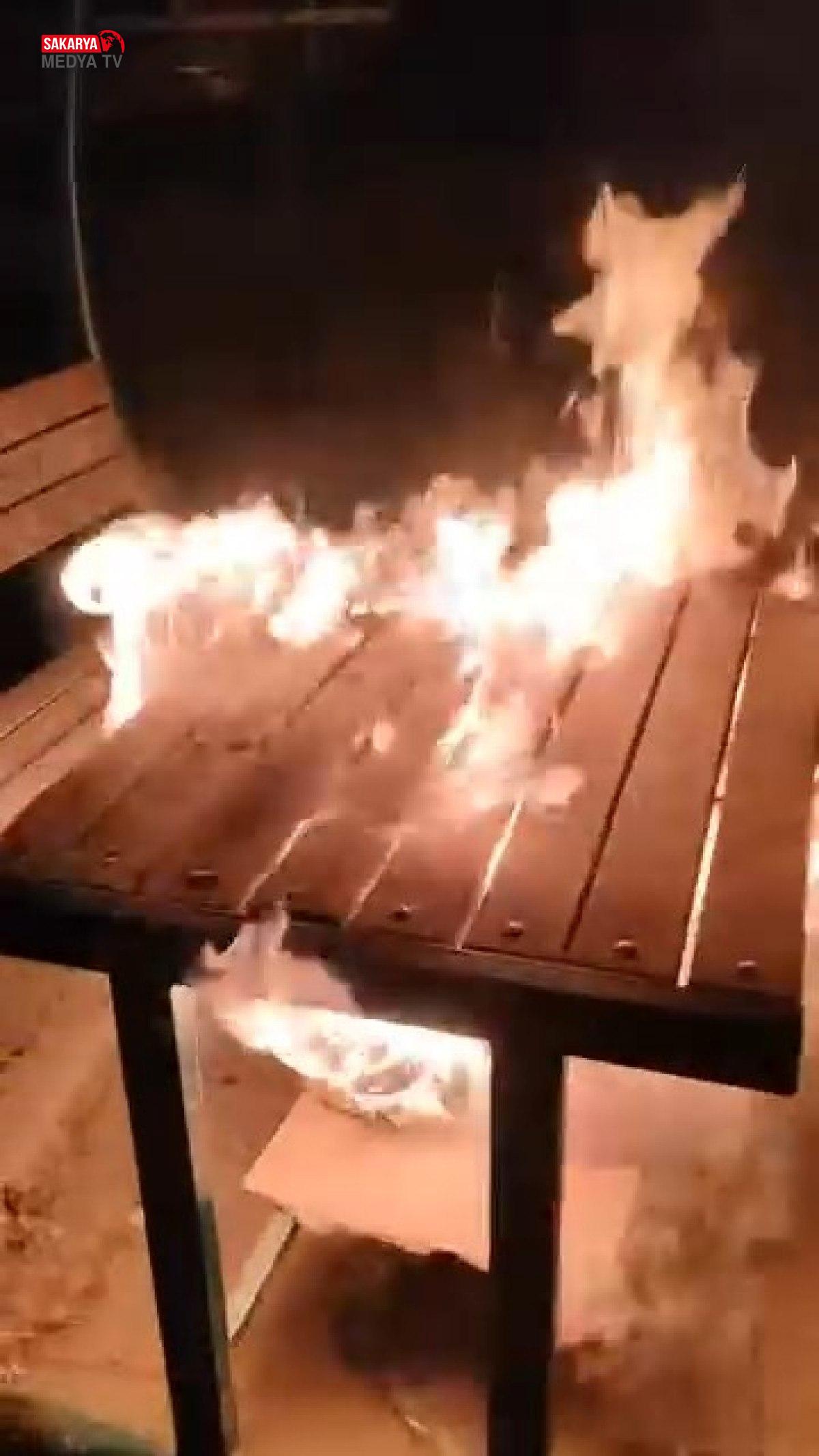 Dün akşam saatlerinde parka gelen üç çocuk, oturdukları bank ve masayı ateşe vererek kundakladı.