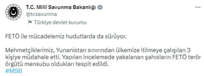 Mehmetçiklerimiz, Yunanistan sınırından ülkemize itilmeye çalışılan 3 kişiye müdahale etti. Yapılan incelemede yakalanan şahısların FETÖ terör örgütü mensubu oldukları tespit edildi.
