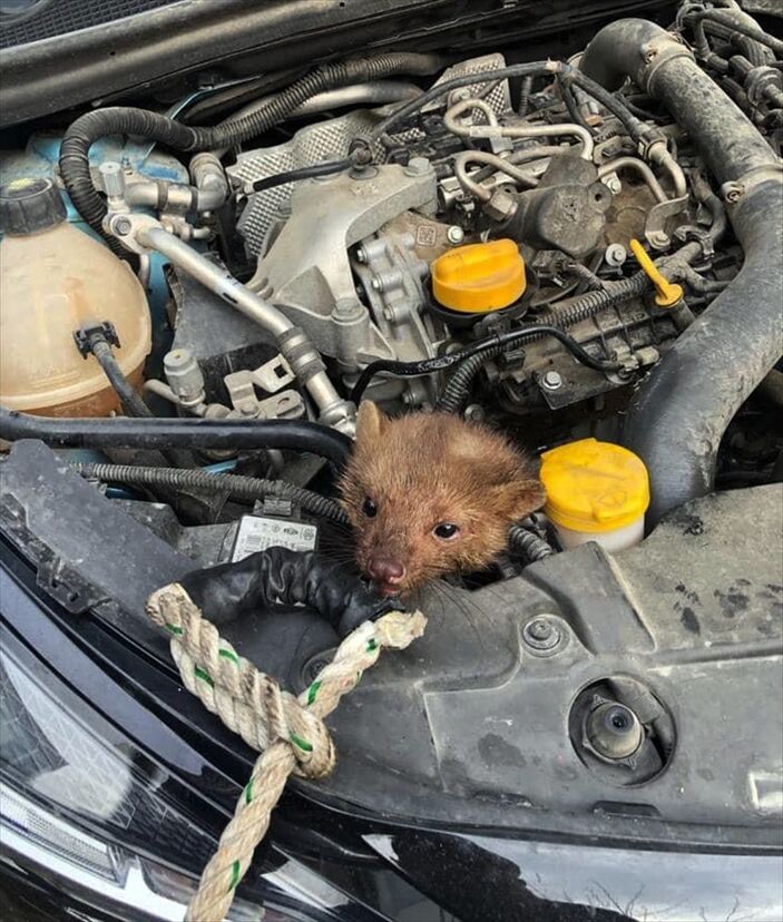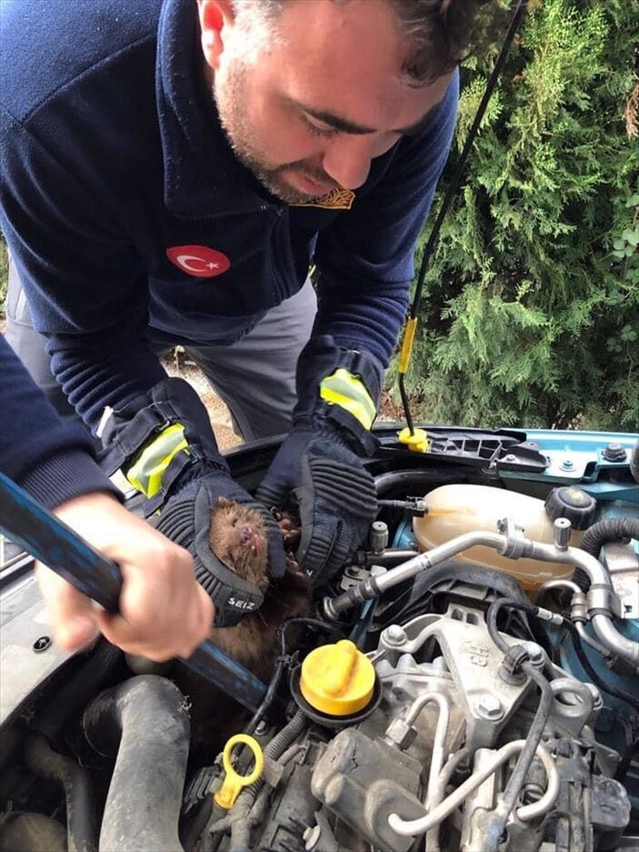 Sinop’un merkez Ada Mahallesi’nde aracından ses geldiğini duyunca kaputunu açan sürücü, motor kısmında bir hayvan bulunduğunu gördü.