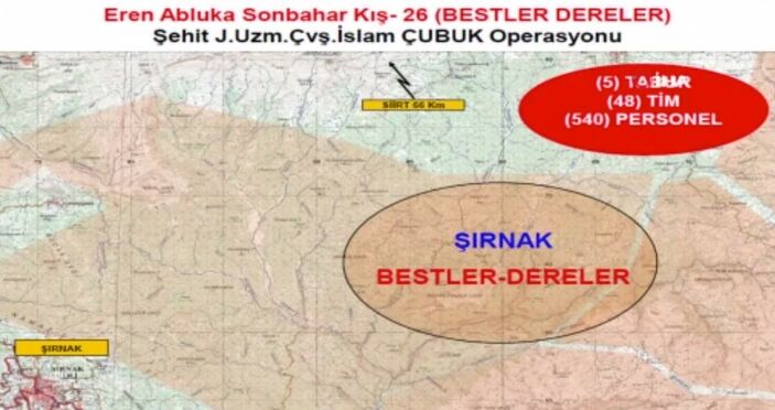 Şırnak’ta “Eren Abluka Sonbahar Kış-26 (Bestler-Dereler) Şehit Jandarma Uzman Çavuş İslam Çubuk” operasyonu başlatıldı. Hedef, terör örgütü PKK’yı ülke gündeminden çıkarmak ve bölgede barındığı değerlendirilen teröristleri etkisiz hale getirmek…