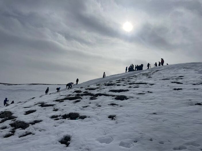 Eline poşet ve kızaklarını alan depremzede çocuklar Sivaslı arkadaşlarıyla Beşik Tepe mevkiinde kar üzerinde kaydı.
