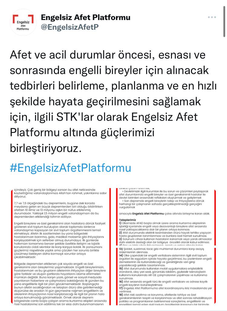 Can kaybı konusunda SMA hastası noktasında bir kaybın şu ana kadar kendilerine ulaşmadığını belirten SMA Benimle Yürü Derneği Başkanı Tarık Pişmiş, “Ayrıca iş birliklerini güçlendimek adına ‘Engelsiz Afet Platformu’ kurduk. Sahada afet platformu ile koordineli çalışıyoruz. İhtiyaca göre bölgedeki ekipler ile iletişme geçiyoruz” açıklamasında bulundu.