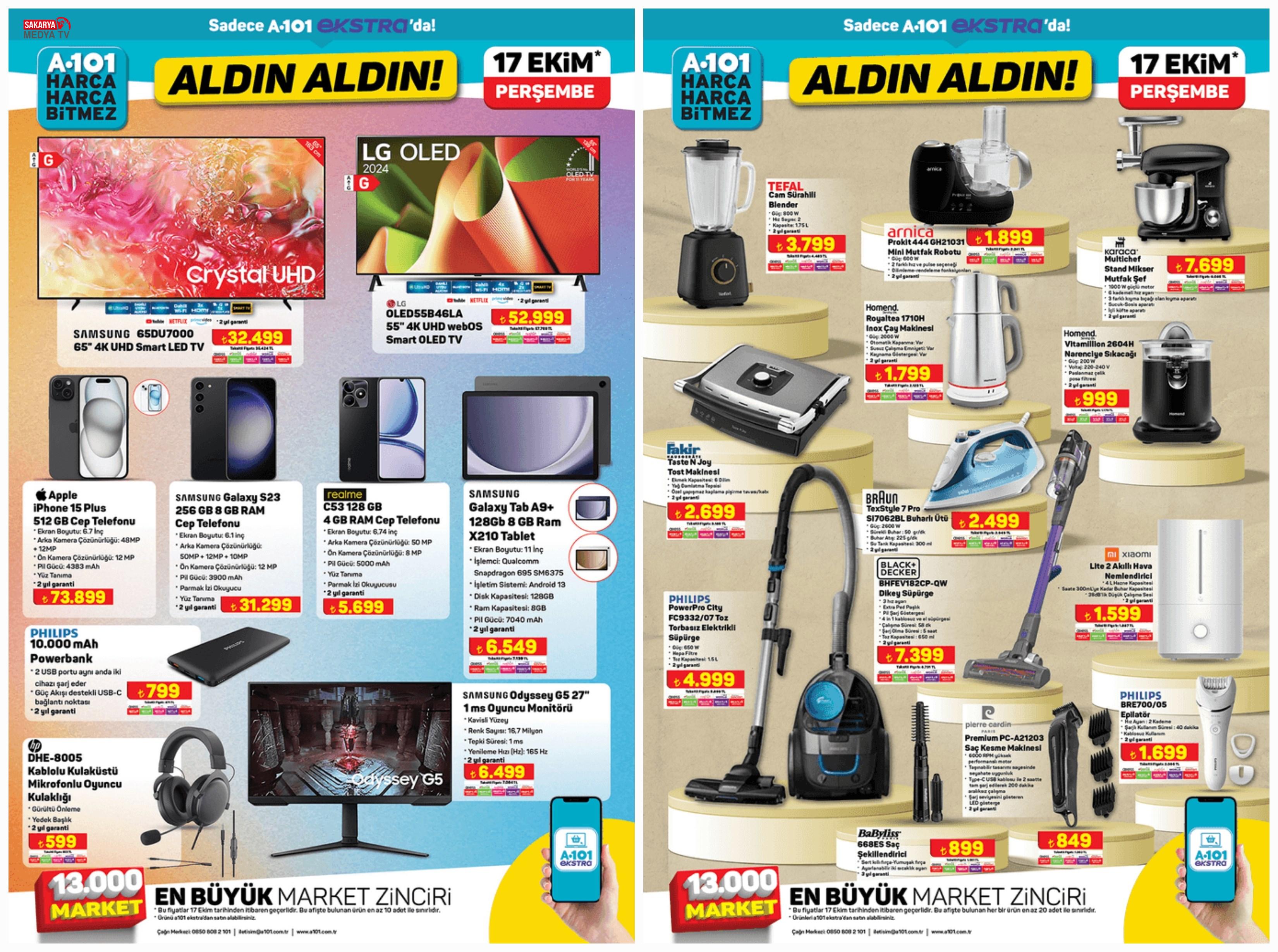 Bu hafta A101 Ekstra kampanyasında akıllı televizyonlardan akıllı telefonlara, tabletlerden kablolu kulaklıklara, dikey süpürgelere ve hava nemlendiricilere kadar farklı teknolojik ürünler bulmak mümkün olacak. 17 Ekim A101 Ekstra teknoloji ürünleri