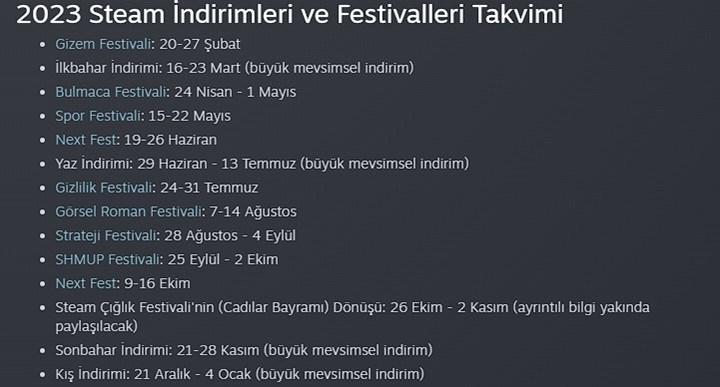 Steam’in en büyük indirim dönemleri genellikle mevsimsel indirimlerde oluyor. Dolayısıyla Steam Bahar İndirimleri, Yaz İndirimleri, Cadılar Bayramı İndirimleri, Sonbahar İndirimleri ve Kış İndirimleri beklenen en büyük indirim dönemleri. Diğerleri ise temalı indirimler olarak ifade ediliyor. Örneğin Spor Festivali esnasında genellikle spor türündeki oyunlarda büyük indirimler yaşanıyor. Bu arada halihazırda Steam Gizem Festivali döneminde olduğumuzu da belirtelim.