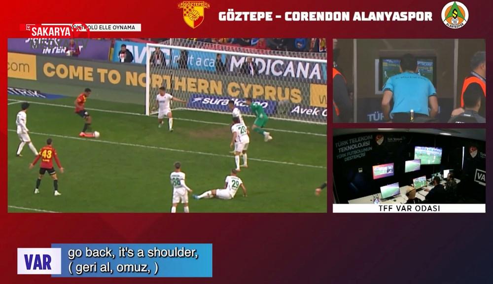 Göztepe – Alanyaspor karşılaşmasının 59. dakikasında sarı-kırmızılıların atağında hakem Arda Kardeşler, ceza alanında elle oynama nedeniyle bir defa daha penaltı noktasını gösterdi. VAR ihtarıyla kenara gelen Kardeşler, savunma oyuncusunun topa omzuyla teması nedeniyle penaltıyı iptal etti.