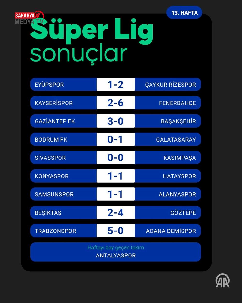 ikas Eyüpspor-Çaykur Rizespor: 1-2 Bellona Kayserispor-Fenerbahçe: 2-6 Gaziantep FK-RAMS Başakşehir: 3-0 Sipay Bodrum FK-Galatasaray: 0-1 Net Küresel Sivasspor-Kasımpaşa: 0-0 TÜMOSAN Konyaspor-Atakaş Hatayspor: 1-1 Reeder Samsunspor-Corendon Alanyaspor: 1-1 Beşiktaş-Göztepe: 2-4 Trabzonspor-Adana Demirspor: 5-0