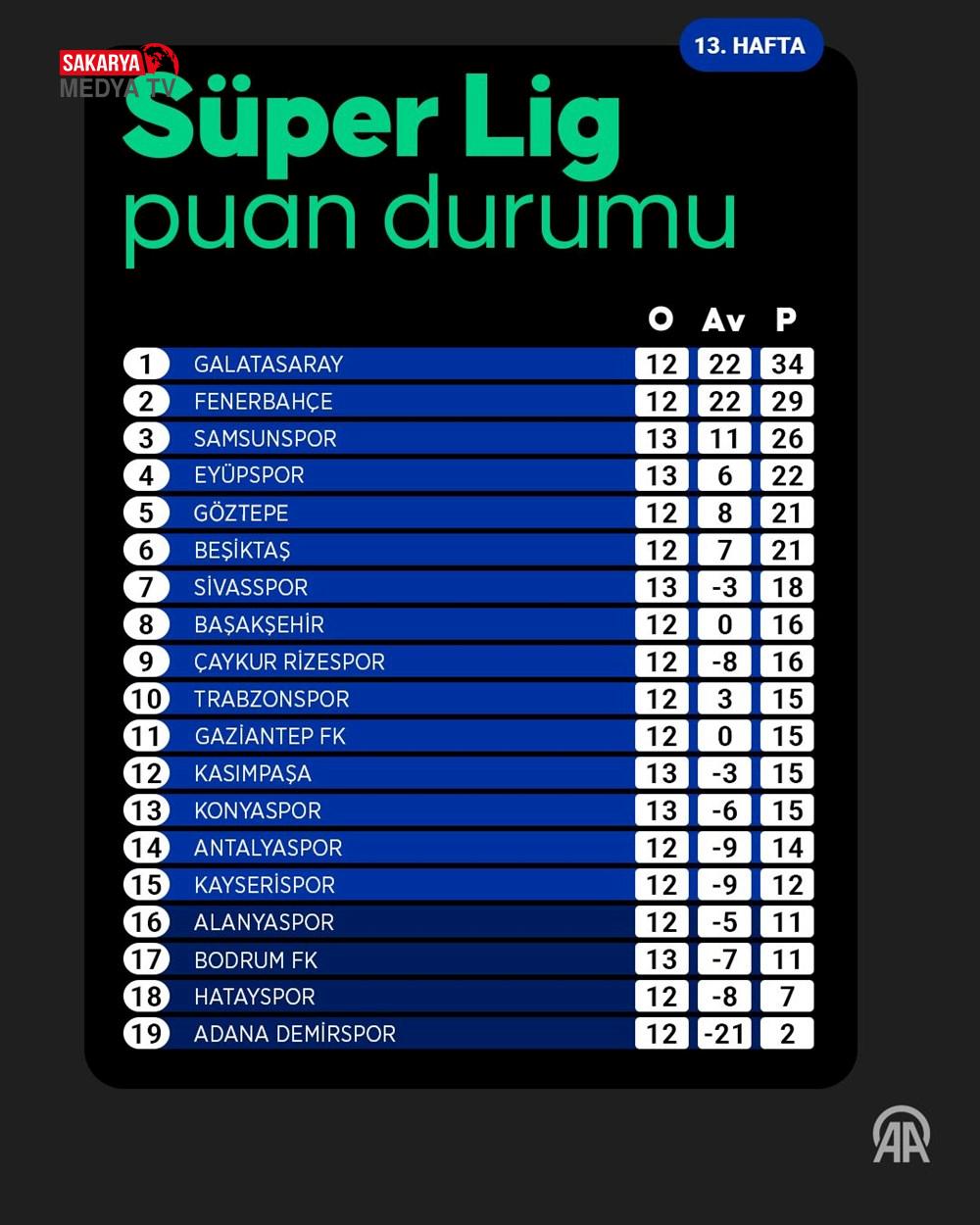 16.00 Çaykur Rizespor-Bellona Kayserispor (Çaykur Didi) 19.00 Galatasaray-ikas Eyüpspor (RAMS Park) 2 Aralık Pazartesi: 20.00 Atakaş Hatayspor-Beşiktaş (Mersin) 20.00 Fenerbahçe-Gaziantep FK (Ülker) NOT: Kasımpaşa haftayı BAY geçecek