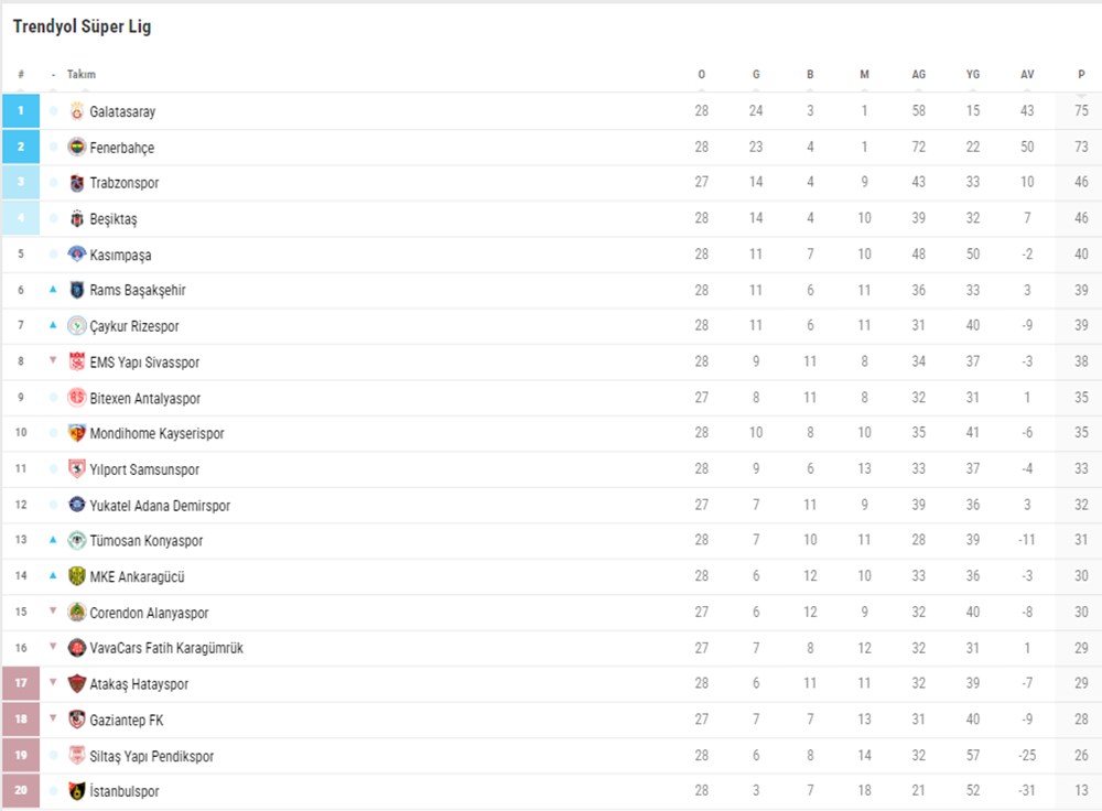 1- GALATASARAY 75 PUAN 2-FENERBAHÇE 73 PUAN 3-TRABZONSPOR 46 4-BEŞİKTAŞ 46 5- KASIMPAŞA 40