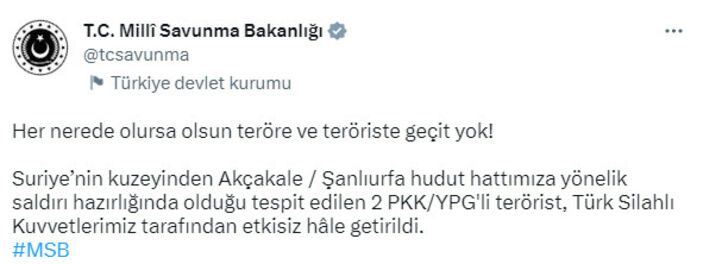 Suriye’nin kuzeyinden Akçakale / Şanlıurfa hudut hattımıza yönelik saldırı hazırlığında olduğu tespit edilen 2 PKK/YPG’li terörist, Türk Silahlı Kuvvetlerimiz tarafından etkisiz hâle getirildi.
