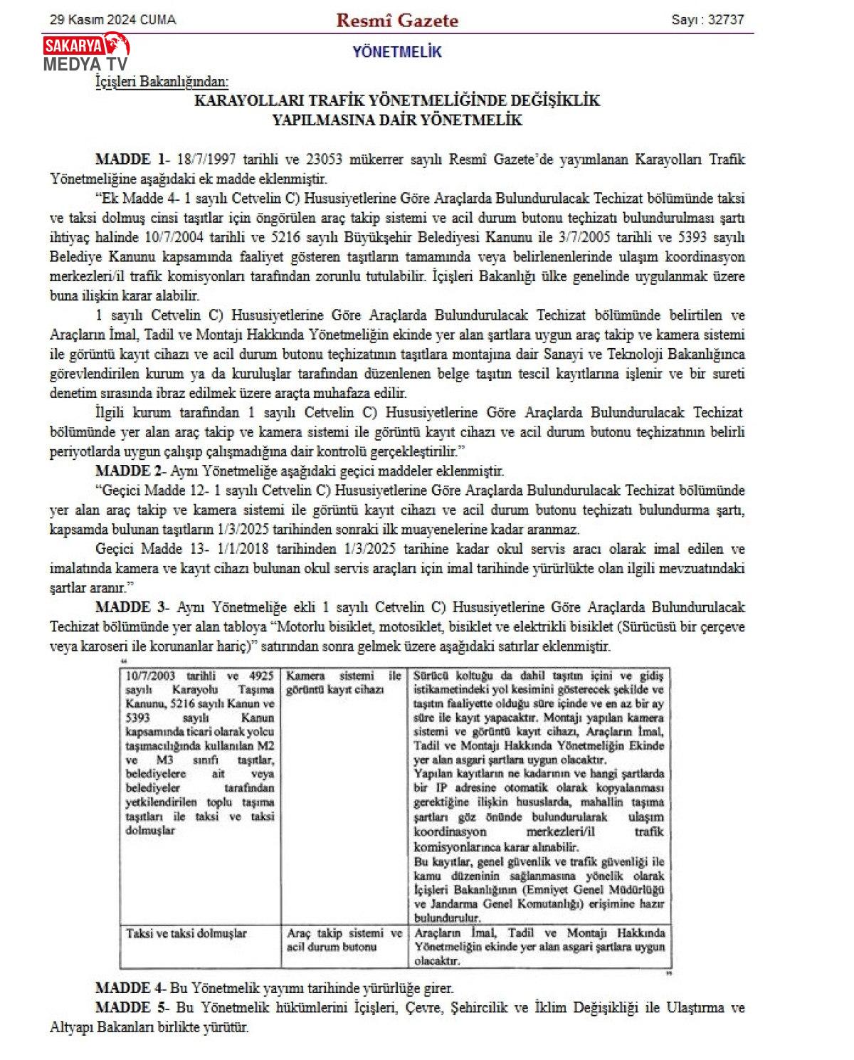 Resmi Gazete’de yayımlanan yönetmelik değişikliğiyle, taksi ve dolmuşlara araç takip sistemi, kamera ve acil durum butonu zaruriliği getirildi.