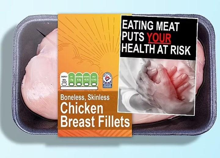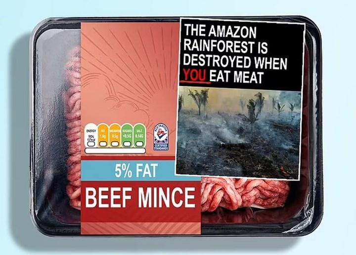 Hepimiz sigara paketlerinin üzerinde, sigara içenleri bu sağlıksız alışkanlıktan vazgeçirmek için tasarlanmış siyah ciğerler veya çürüyen dişlerin korkunç görüntülerini görmeye alışkınız. Bilim insanları benzer etiketleri süpermarketlerdeki et paketlerinin üzerine yapıştırarak alıcıların dikkatini çekmek istiyor. Çıkartmalarda üzücü hayvan resimlerinin yanı sıra “Siz et yediğinizde hayvanlar acı çekiyor.” gibi mesajların yer alması gündemde. Ayrıca bu etiketlerde yok edilen ormanların görüntüleriyle birlikte “Siz et yediğinizde Amazon yağmur ormanları yok oluyor.” şeklinde uyarıların yer alması da öneriliyor.