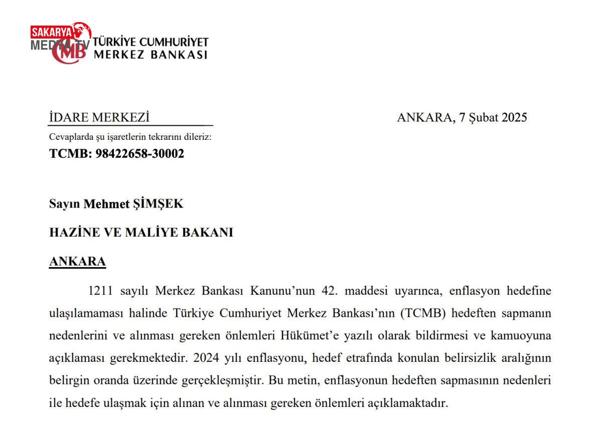 Mektupta, 1211 sayılı Merkez Bankası Kanunu’nun 42. maddesi uyarınca, enflasyon hedefine ulaşılamaması halinde TCMB’nin hedeften sapmanın nedenlerini ve alınması gereken önlemleri hükümete yazılı olarak bildirmesi ve kamuoyuna açıklaması gerektiği anımsatıldı.