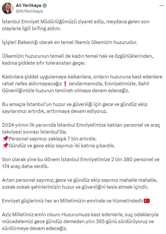 Sosyal medya hesabından açıklama yapan Yerlikaya şunları söyledi: “İstanbul Emniyet Müdürlüğümüzü ziyaret edip, meydana gelen son olaylarla ilgili brifing aldım. İçişleri Bakanlığı olarak en temel unsurumuz ülkemizin huzurudur.