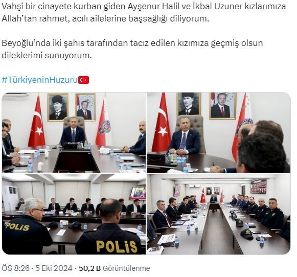 Emniyet güçlerimiz her an Milletimizin buyruğunda ve hizmetindedir Aziz Milletimiz emin olsun: Huzurumuza kast edenlerle, cürüm odaklarıyla uğraşımızı gece gündüz demeden yılın 365 günü sürdürüyoruz ve sürdürmeye devam edeceğiz. Yırtıcı bir cinayete kurban giden Ayşenur Halil ve İkbal Uzuner kızlarımıza Allah’tan rahmet, acılı ailelerine başsağlığı diliyorum. Beyoğlu’nda iki şahıs tarafından tacız edilen kızımıza geçmiş olsun dileklerimi sunuyorum.”
