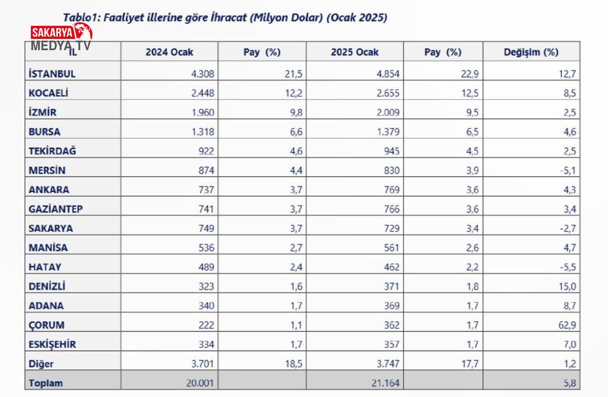2025 yılı Ocak ayında ise geçen yılın tıpkı ayına nazaran faaliyet vilayetleri bazında ihracatta en fazla artış incelendiğinde sırasıyla vilayet bazında liste şöyle: